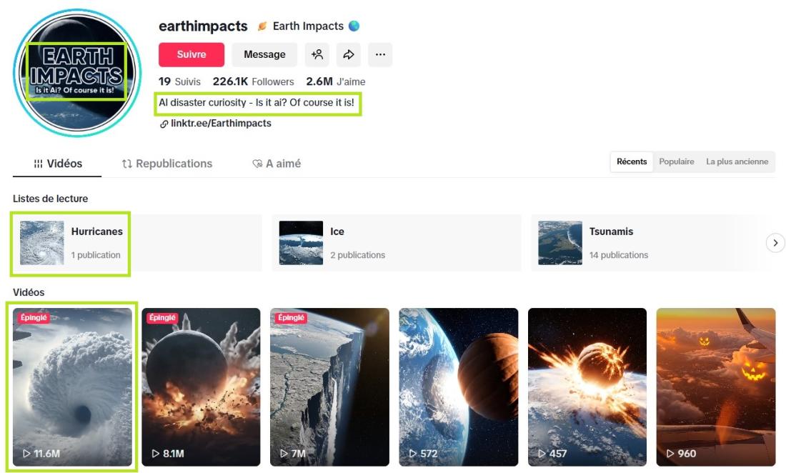 Dans la description du compte TikTok à l'origine de ces vidéos, on peut lire : "curiosités sur les désastres avec l'IA". Sur la photo de profil, il est également écrit en anglais : "Is it AI? Of course it is!" ("Est-ce que c'est de l'IA ? Bien sûr que oui !", en français). Ce compte a notamment des dizaines de publications similaires, montrant des prétendus phénomènes naturels, enregistrés depuis l'intérieur d'avions, comme ici et là. Mais en réalité, la plupart de ses vidéos sont générées par IA.