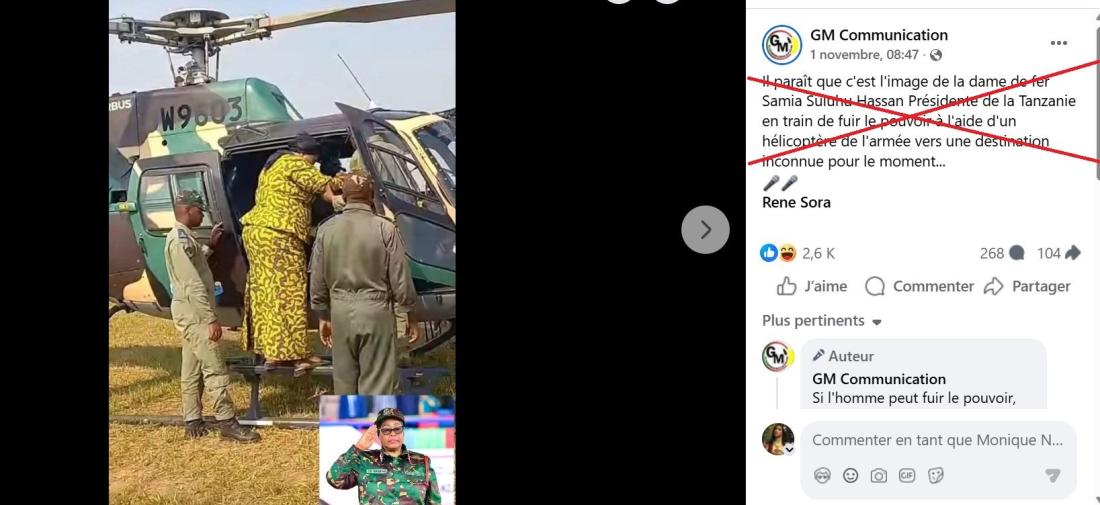 "Il paraît que c'est l'image de la dame de fer Samia Suluhu Hassan, Présidente de la Tanzanie, en train de fuir le pouvoir à l'aide d'un hélicoptère de l'armée vers une destination inconnue pour le moment", peut-on lire sur la page Facebook d'une organisation basée au Burkina Faso, dans une publication "aimée" plus de 2.500 fois (lien archivé ici).