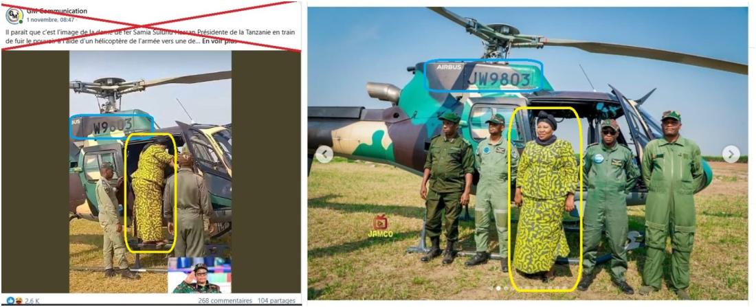 Dans ce contexte, de nombreuses publications relayent depuis le 1er novembre l’image d’une femme qui monte dans un hélicoptère, affirmant qu’il s’agirait de Samia Suluhu Hassan fuyant la colère des citoyens tanzaniens.