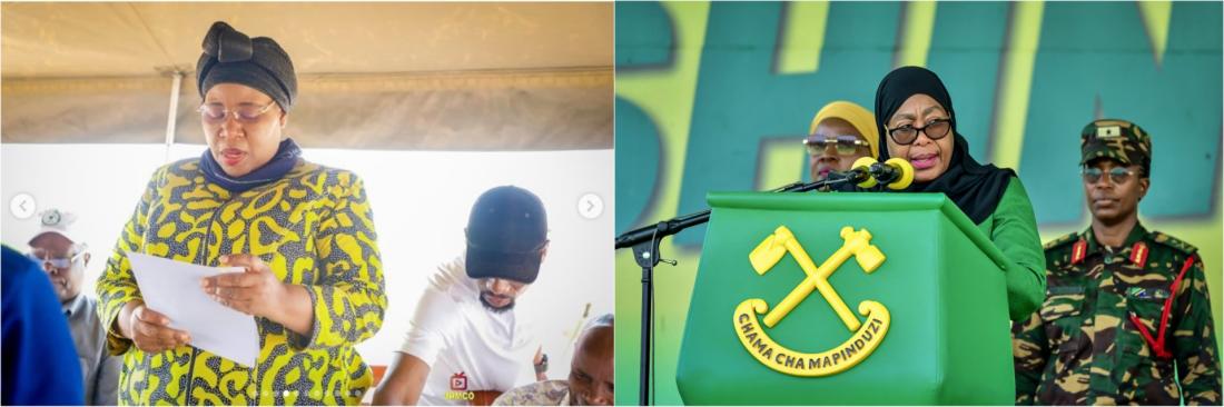 de la présidente Samia Suluhu Hassan lors d’une conférence de presse le 28 octobre 2025 (à droite) (AFP / Michael JAMSON)