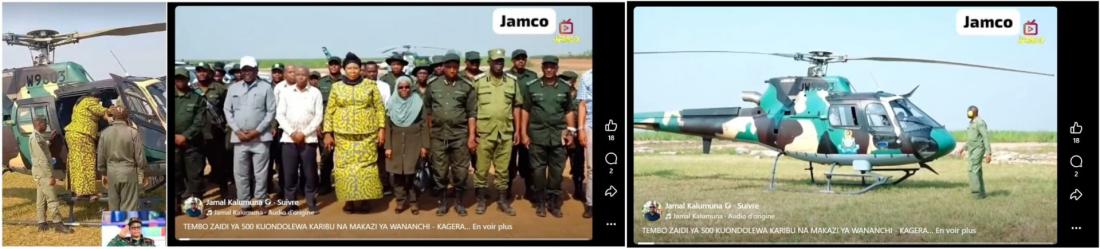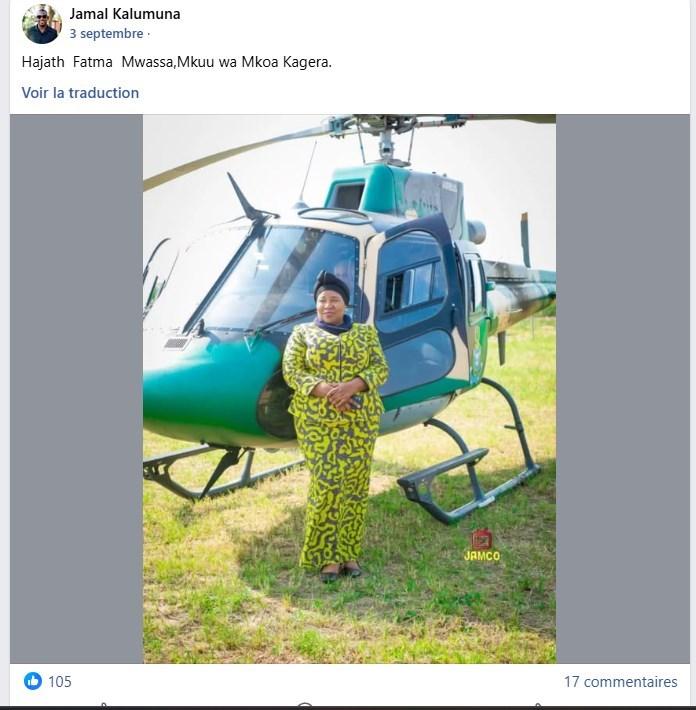 Sur ce même compte Facebook au nom de Jamal Kalumuna, on retrouve d'autres contenus concernant cette intervention de Fatma Mwassa, dont une photo où elle se tient debout près d'un hélicoptère, face au photographe, vêtue comme sur l’image devenue virale (archivée ici).