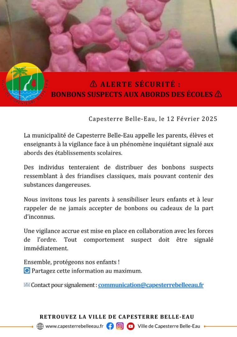 Selon la presse locale - Guadeloupe la 1ère, France-Antilles et RCI -, un collégien aurait raconté à sa mère qu'un homme l'avait abordé pour lui proposer un bonbon. L'enfant aurait refusé. "Après un signalement en mairie, une main courante a été déposée au commissariat de la commune, selon Annick Choisi, maire adjointe en charge de la réglementation et de la sécurité de Capesterre Belle-Eau", peut-on lire dans l'article du 13 février de Guadeloupe la 1ère (liens archivés ici, ici et ici).