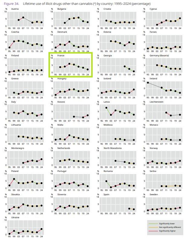 Selon le dernier rapport du Projet européen d'enquête en milieu scolaire sur l'alcool et les autres drogues (ESPAD), publié en octobre 2025, la consommation à vie (entre 1995 et 2024) de drogues illicites - autres que le cannabis - a diminué au cours des 10 dernières années (lien archivé ici). L'ESPAD mène des enquêtes tous les quatre à cinq ans depuis 1995, ciblant les élèves âgés de 15 à 16 ans dans 37 pays.