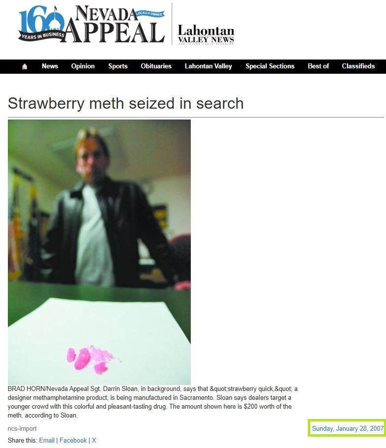 En effectuant une recherche par mots-clés, l'AFP a retrouvé un article publié le 28 janvier 2007 sur le site d'un média régional du Nevada relatant une opération policière : "Une nouvelle sorte de méthamphétamine, à la saveur de fraise et à la coloration rose vif, a été saisie pour la première fois à Carson City, lors d'une perquisition dans un appartement de la rue Como", indique l'article. Selon ce média, une personne avait été arrêtée, accusée de "vendre la méthamphétamine aromatisée, connue dans la région de Sacramento, et désormais à Carson City, sous le nom de 'Strawberry Quick'" (lien archivé ici).