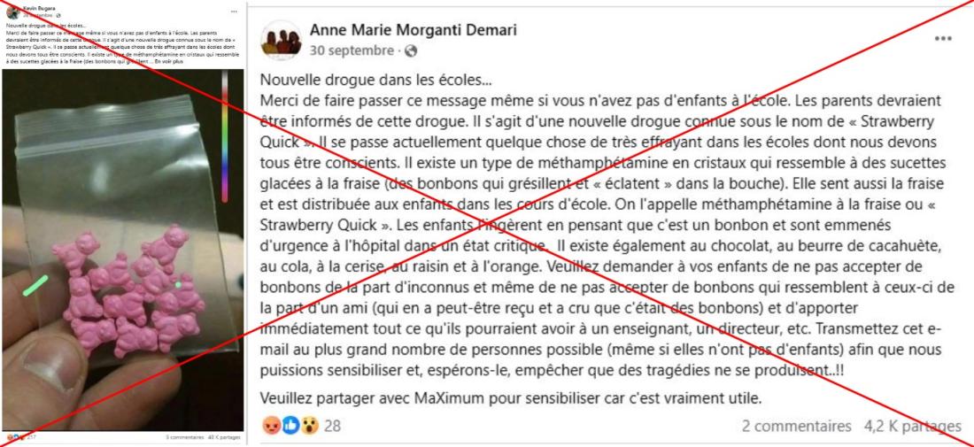 "Nouvelle drogue dans les écoles... Merci de faire passer ce message même si vous n'avez pas d'enfants à l'école. Les parents devraient être informés de cette drogue. Il s'agit d'une nouvelle drogue connue sous le nom de 'Strawberry Quick'", affirme un post Facebook daté du 28 septembre 2025. Depuis sa mise en ligne, la publication a cumulé plus de 48.000 partages et des centaines de réactions. Si le post est illustré d'une photo montrant une main tenant un sachet transparent, rempli de comprimés roses en forme d'oursons roses, il ne fournit aucune information sur le lieu ou les établissements où cette prétendue drogue serait distribuée.