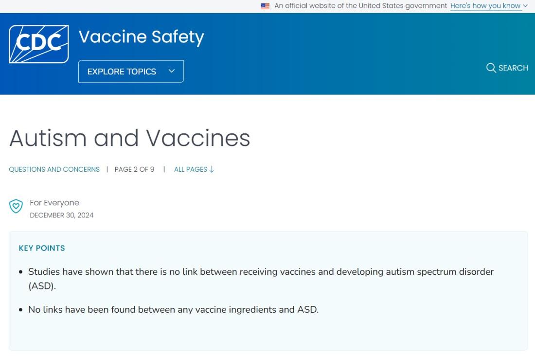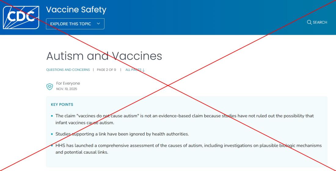Le 19 novembre 2025, les Centres pour le contrôle et la prévention des maladies (CDC) ont modifié leur site internet et partagent désormais une fausse théorie avançant un lien causal possible entre vaccins et autisme (lien archivé ici).