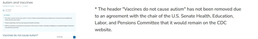 Le site prête par ailleurs à confusion car y figure encore la mention "les vaccins ne causent pas l'autisme", suivie d'un astérisque qui renvoie vers une explication : le titre "n'a pas été supprimé en raison d'un accord avec le président de la commission sénatoriale américaine chargée de la santé, de l'éducation, du travail et des retraites, stipulant qu'il resterait sur le site web du CDC."