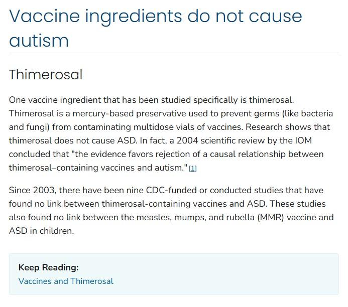 Si le thiomersal ne figure désormais plus sur la page "Autisme et vaccins" du site, il est toujours mentionné sur la page "Thiomersal et vaccins". On peut y lire que "les recherches ne démontrent aucun lien entre le thiomersal contenu dans les vaccins et l'autisme", ce qui reflète le consensus médical sur le sujet.