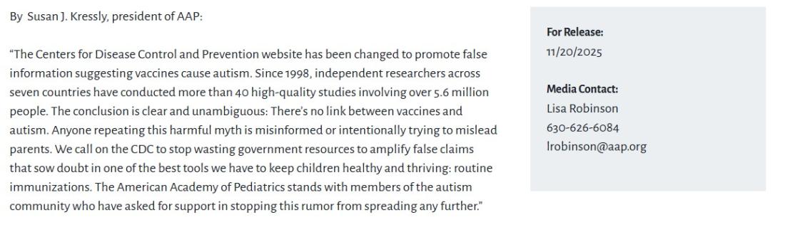 Susan Kressly, présidente de l'Académie américaine de pédiatrie, a quant à elle réagi dans un communiqué le 20 novembre 2025 : "Nous demandons aux CDC de cesser de gaspiller les ressources gouvernementales pour amplifier de fausses affirmations qui sèment le doute sur l'un des meilleurs outils dont nous disposons pour maintenir les enfants en bonne santé et en pleine croissance : la vaccination de routine" (liens archivés ici et ici).