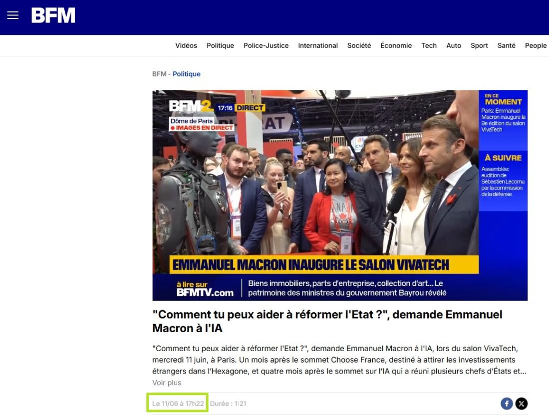 Dans la vidéo originale, lorsque le président français lui demande comment l'IA pourrait contribuer à reformer l'Etat, le robot lui répond : "L'IA peut aider le secteur public à optimiser ses opérations, par exemple, pour gérer l'approvisionnement ou améliorer les services aux citoyens. On a aidé un port à accélérer le passage des cargaisons essentielles".