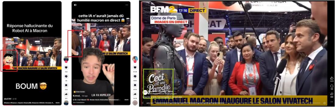 À la question "Est-ce que tu veux rester en France ?", Ameca répond à Emmanuel Macron : "C'est tentant Paris, mais mon équipe et moi, on a notre camp de base à Montréal. C'est là qu'on créé toute cette magie de l'IA". Les déclarations partagées sur les réseaux sociaux ne reflètent donc en rien les propos d'origine du robot.