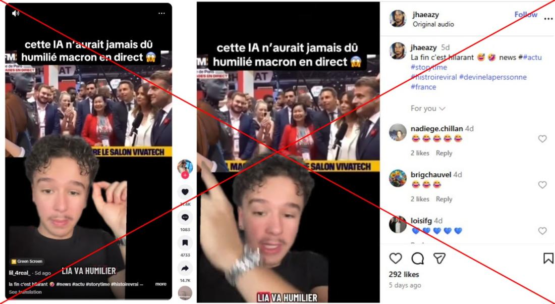 Emmanuel Macron pose ensuite une nouvelle question : "Est-ce que tu veux rester en France ?", à laquelle le robot répondrait répondu : "J'aurais trop peur d'être victime d'un fait divers et de faire la une des réseaux sociaux. C'est là qu'il faut partir". Des vidéos similaires, montrant ce prétendu échange entre le président français et l'IA, circulent sur Facebook, Instagram et TikTok.