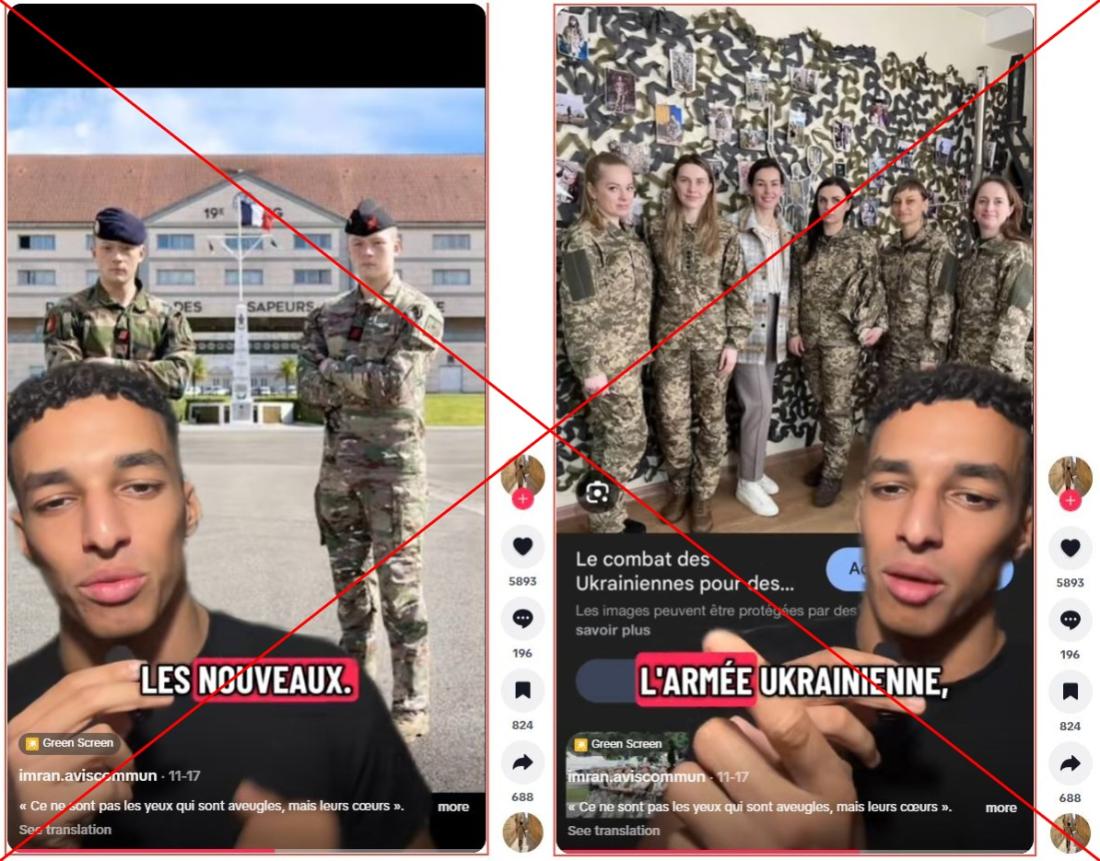 "Aujourd'hui on le sait, la France va entrer en guerre en Ukraine, et parmi toutes les choses qu'on a déjà dites pour le prouver, comme le fait que la plus haute personnalité de l'armée française [le général Fabien Mandon, NDLR] ait dit que la France devait se préparer à une guerre contre la Russie, eh bien il s'est récemment ajouté un nouvel élément. Les treillis de l'armée française sont en cours de changement depuis cette année : à gauche vous avez les anciens treillis, et à droite vous avez les nouveaux", affirme un internaute dans une vidéo TikTok publiée le 17 novembre 2025, partagée près de 700 fois et cumulant plus de 125.000 vues (lien archivé ici).