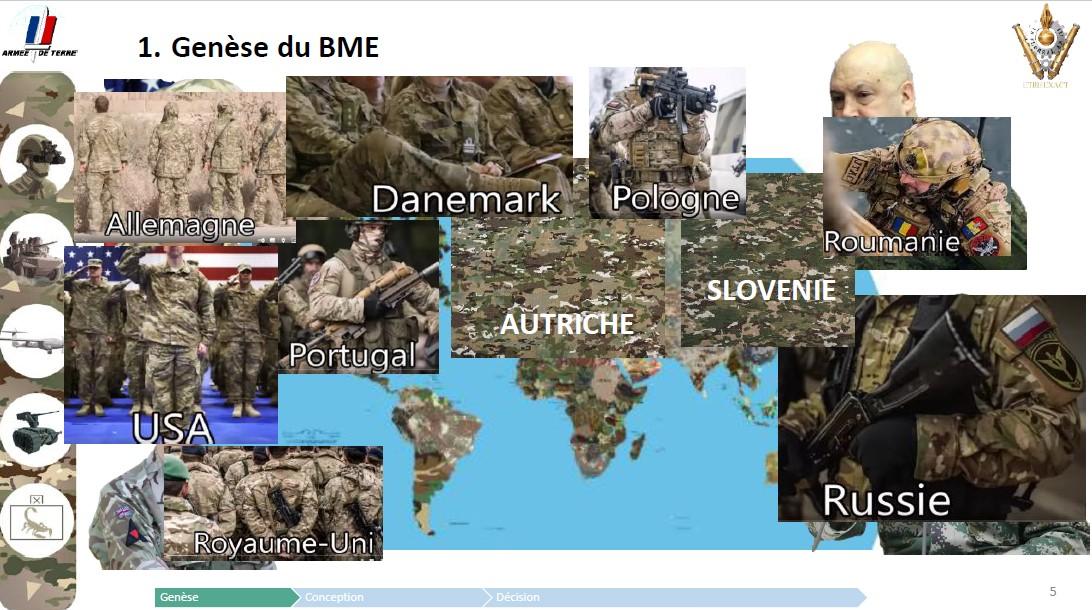 Deuxièmement, sur le plan logistique, le BME est destiné à remplacer les deux bariolages actuellement en vigueur dans les forces conventionnelles françaises, les bariolages Centre-Europe (CE) et désert, tout en créant un bariolage zone enneigée (lien archivé ici).
