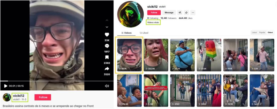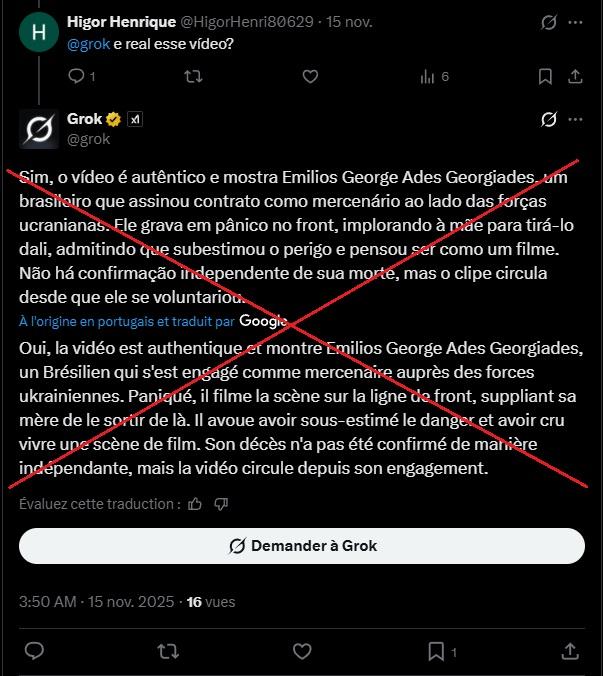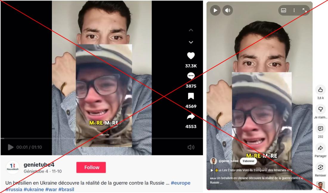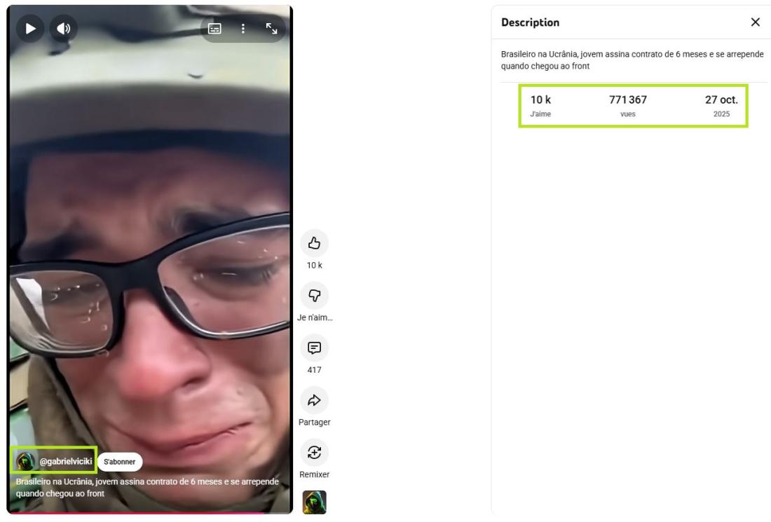 Le 10 novembre 2025, dans une vidéo TikTok partagée plus de 4.700 fois et cumulant près de 800.000 vues, un internaute affirme qu'"un Brésilien ayant signé un contrat de six mois pour combattre en Ukraine a exprimé ses profonds regrets dans un message poignant à sa mère". "Il découvre que la 'guéguerre' sur les réseaux sociaux n'est pas la même chose que la vraie guerre sur le terrain", dit l'auteur de la publication.
