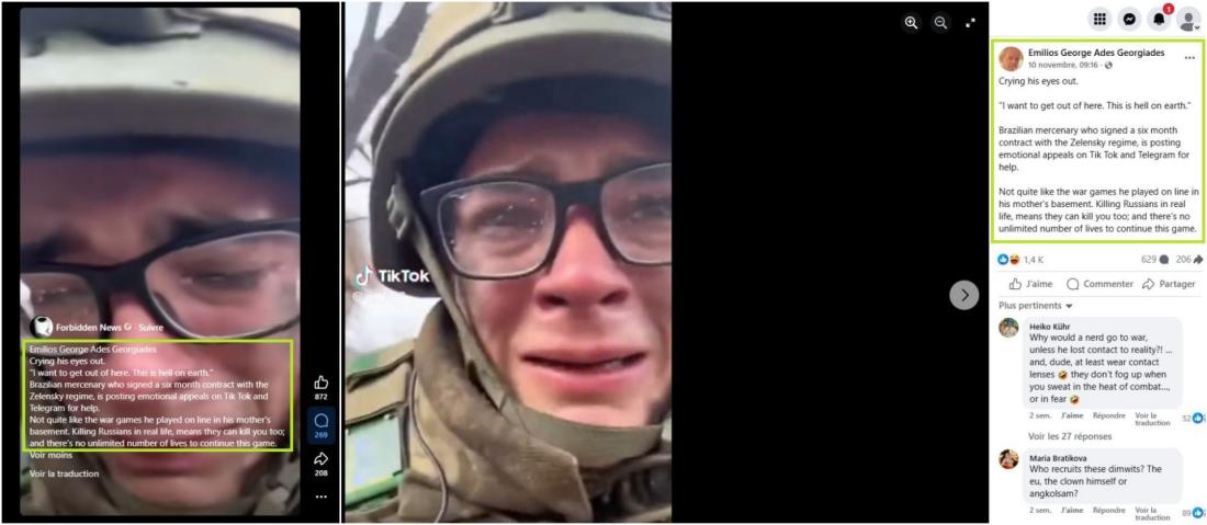 Le matin du 10 novembre, cet internaute avait publié une capture d'écran de la vidéo virale du jeune Brésilien sur Facebook, en écrivant en anglais : "'Je veux sortir d'ici. C'est l'enfer sur terre'. Un mercenaire brésilien qui a signé un contrat de six mois avec le régime Zelensky, publie des appels émotionnels sur Tik Tok et Telegram pour obtenir de l'aide. Pas tout à fait comme les jeux de guerre qu'il a joué en ligne dans le sous-sol de sa mère. Tuer des Russes dans la vraie vie signifie qu'ils peuvent vous tuer aussi ; et il n'y a pas de nombre illimité de vies pour continuer ce jeu". Plus tard dans la journée, "Forbidden News" a recopié mot pour mot ces propos, ajoutant son nom complet en haut de la description.