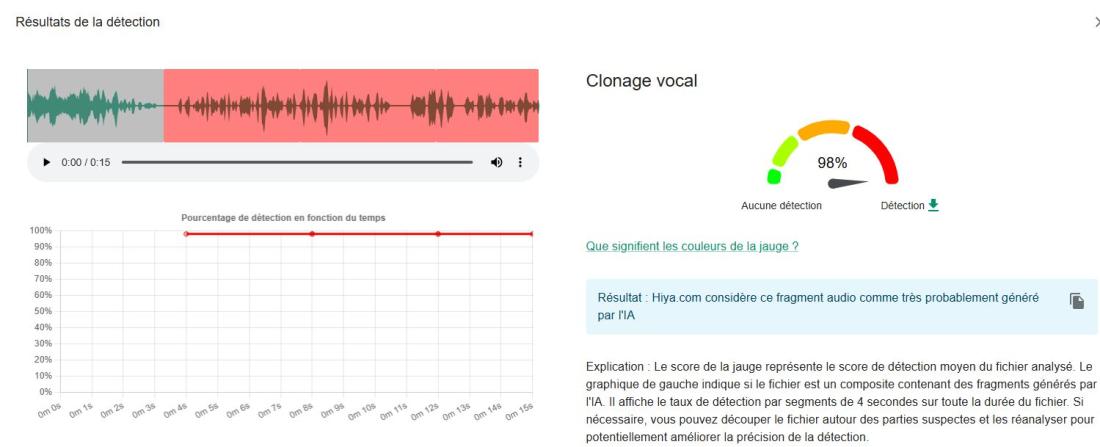 Enfin, une analyse audio de la vidéo virale, réalisée à l'aide du détecteur de deepfakes Hiya.com sur l'outil (cocréé par l'AFP) de vérification InVID-WeVerify, estime que la voix off du jeune homme a été très probablement générée par IA, avec un score de 99%.