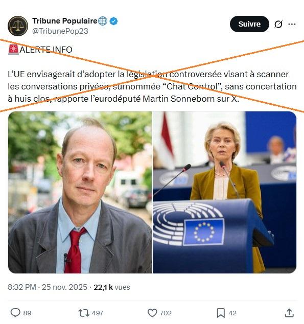Sur X, un post datant du 25 novembre 2025 affirme que "l'EU envisagerait d'adopter la législation controversée visant à scanner les conversations privées, surnommée 'ChatControl', sans concertation à huis clos, rapporte l'eurodéputé Martin Sonneborn sur X".