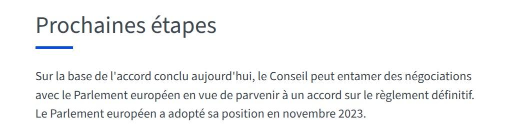 Les affirmations selon lesquelles l'Union européenne envisageait "d'adopter la législation" ont, quant à elles, confondu l'adoption définitive de la loi, dont le texte doit encore passer plusieurs étapes du processus législatif européen, et l'étude de la proposition de loi par les représentants des Etats membres réunis au sein du Conseil.