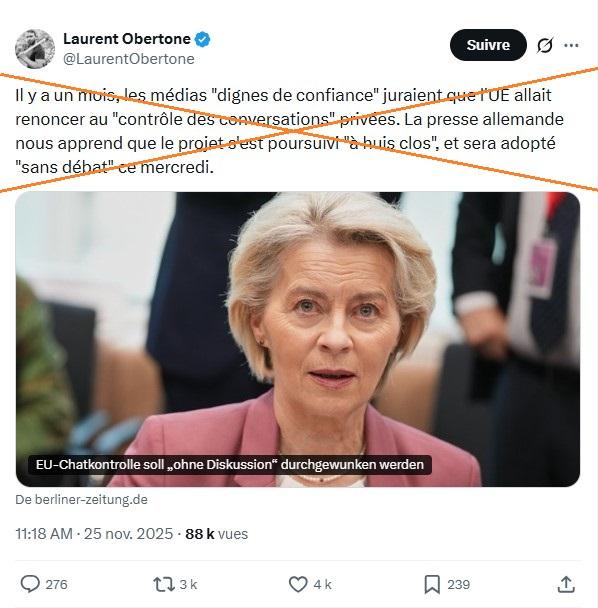 "Il y a un mois, les médias 'dignes de confiance' juraient que l'UE allait renoncer au 'contrôle des conversations' privées. La presse allemande nous apprend que le projet s'est poursuivi 'à huis clos', et sera adopté 'sans débat' ce mercredi", peut-on lire dans un autre post, partagé et aimé des milliers de fois depuis sa publication le 25 novembre 2025.