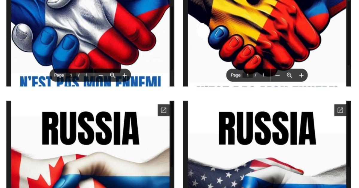Les visuels, repérés notamment sur X, TikTok, VK et Facebook, reprennent tous la même composition : deux mains entrelacées, aux couleurs des drapeaux français et russe. Des vidéos largement relayées en ligne montrent également des affiches identiques placardées sur des murs dans des rues françaises.