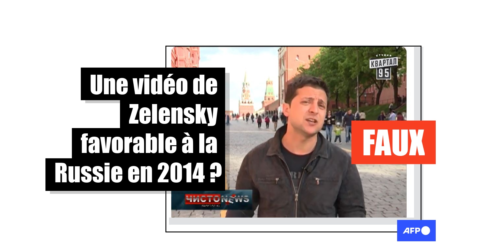 Incarnation de la résistance ukrainienne à la Russie, Volodymyr Zelensky fait depuis 2022 l'objet de nombreuses campagnes de désinformation en ligne. Dans ce contexte, un extrait vidéo datant de 2014 est régulièrement relayé sur les réseaux sociaux : on le voit sur la place Rouge de Moscou évoquer les nationalistes ukrainiens désignés sous le nom de "bandéristes", un terme régulièrement utilisé par la Russie pour désigner de manière péjorative ses ennemis en Ukraine. Mais cette vidéo est sortie de son contexte : il s'agit en réalité d'un extrait d'une émission parodique, dans laquelle apparaissait le président ukrainien du temps où il était comédien.