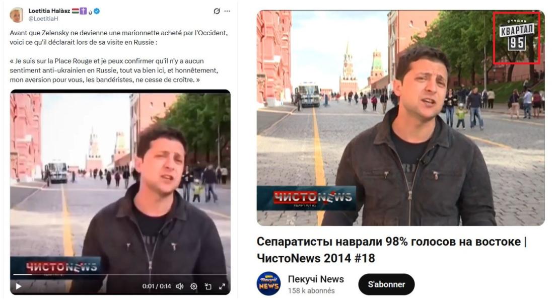 Mais plusieurs indices montrent que la vidéo partagée par les comptes prorusses a été tronquée à dessein. Dans les publications trompeuses, la vidéo a été recadrée pour couper le logo de la société Kvartal 95, et faire ainsi croire que le futur président ukrainien s'exprime en son nom propre et non dans le cadre d'une émission humoristique.