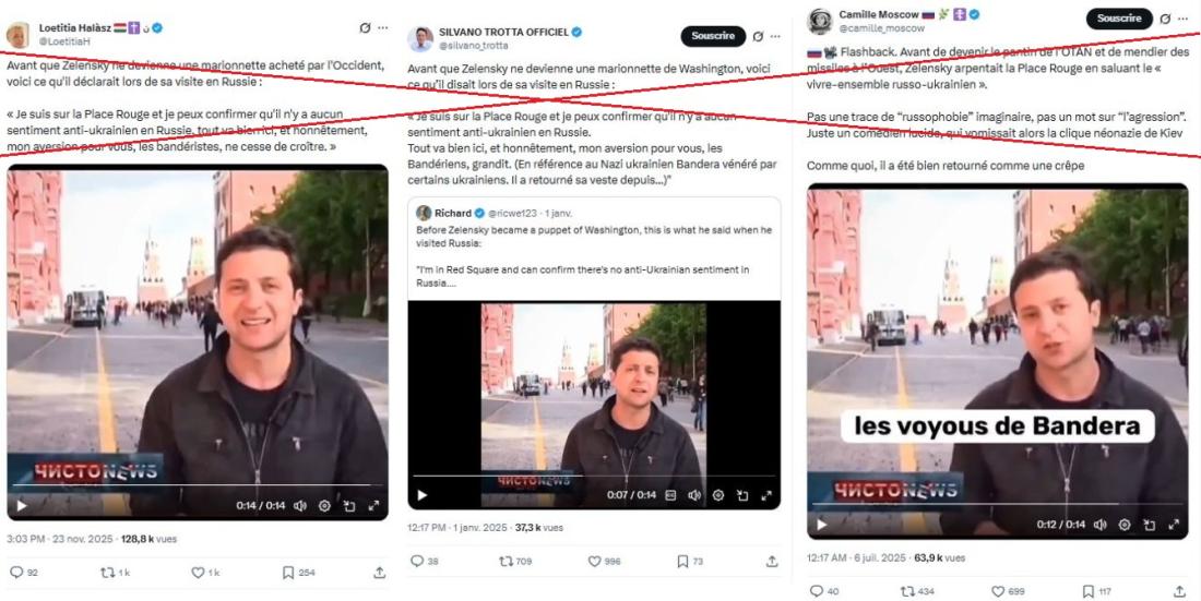 Sur l'extrait de 14 secondes, on aperçoit effectivement le président ukrainien, visiblement plus jeune, avec les tours rouges du Kremlin en arrière-plan. Celui-ci s'exprime en russe, sa langue natale, avec un enthousiasme manifeste. La même séquence a été partagée dans cette publication de juillet 2025, et dans celle-ci en janvier 2025, par deux comptes relayant régulièrement des fausses informations visant l'Ukraine et ses alliés.