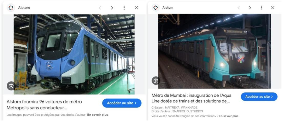 D'autres recherches d'images inversées nous permettent ensuite de retrouver les photos 2 et 4 directement sur le site du constructeur ferroviaire français Alstom. Elles sont utilisées ici et là dans des communiqués de presse annonçant la conclusion de contrats avec les villes indiennes de Chennai et Mumbai pour la fourniture de rames sans conducteur (lien archivé ici et ici).