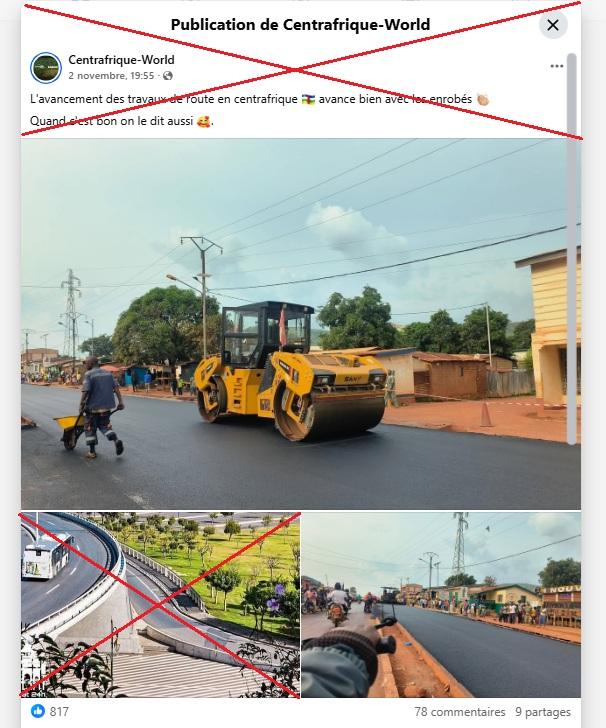 "Des travaux de route en Centrafrique avance [sic] bien. Quand c'est bon on le dit aussi", affirme par exemple une publication partagée sur Facebook le 2 novembre 2025 (lien archivé ici).