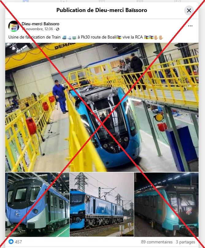 Mais en réalité, aucune de ces photos n’a été prise en Centrafrique. Ces clichés, pris en France ou en Inde ces dernières années, montrent tous des rames du constructeur ferroviaire français Alstom.