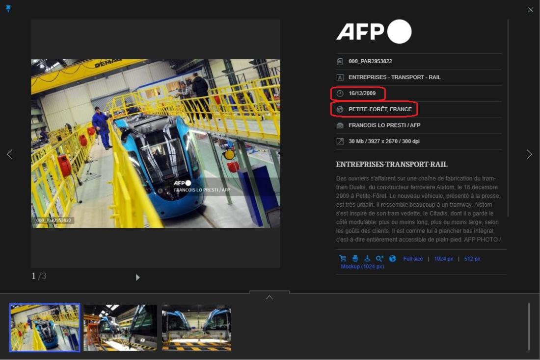 Grâce à ces indications, on retrouve l'image sur le site de l'AFP (lien archivé ici). Les métadonnées nous confirment que la photo a bien été prise en France, le 16 décembre 2009, et qu'elle n'a rien à voir avec une prétendue usine en Centrafrique.