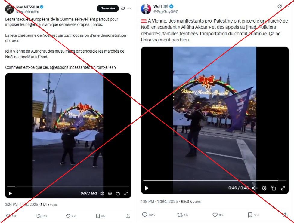 D'autres publications propagent des récits similaires, partageant cette fois des vidéos d'une manifestation à Vienne pour prétendre que "des musulmans" auraient "encerclé les marchés de Noël et appelé au djihad, les qualifiant "d'agressions". On retrouve ces publications sur X et Facebook, et dans plusieurs langues : en tchèque, grec, en roumain et en allemand.