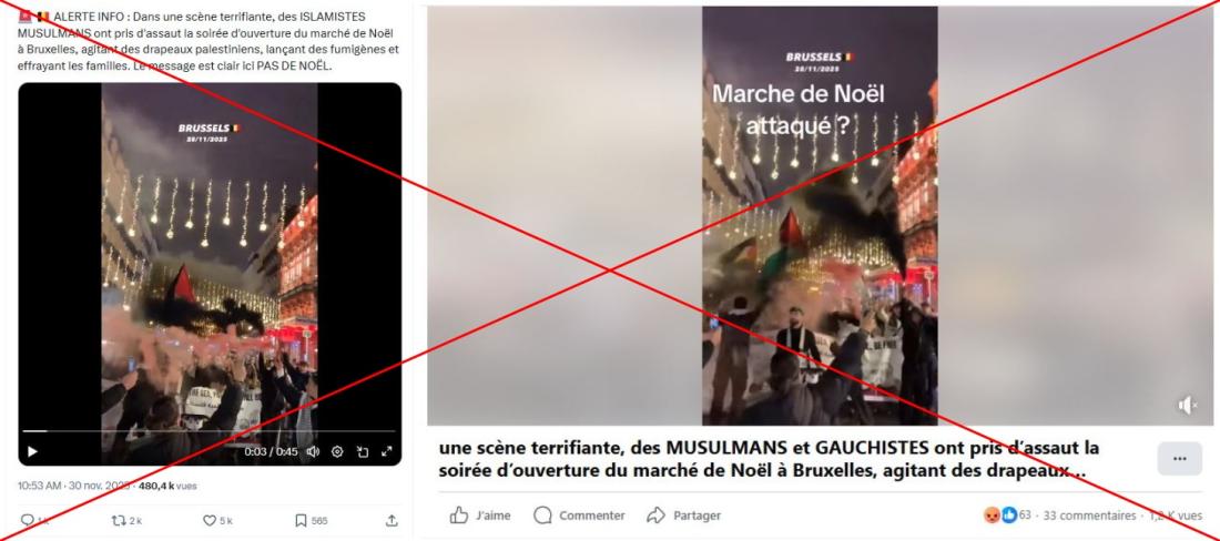 "ALERTE INFO", s'écrie un internaute en légende d'une vidéo publiée sur X, "des ISLAMISTES MUSULMANS ont pris d'assaut la soirée d'ouverture du marché de Noël à Bruxelles, agitant des drapeaux palestiniens, lançant des fumigènes et effrayant les familles". Et de conclure : "le message est clair : ici PAS DE NOËL". La publication, reprise presque à l'identique sur X (1, 2), TikTok et Facebook, est là aussi accompagnée de légendes et de commentaires dramatiques : "Le marché de Noël attaqué", "Des musulmans encerclent les marchés de Noël"...
