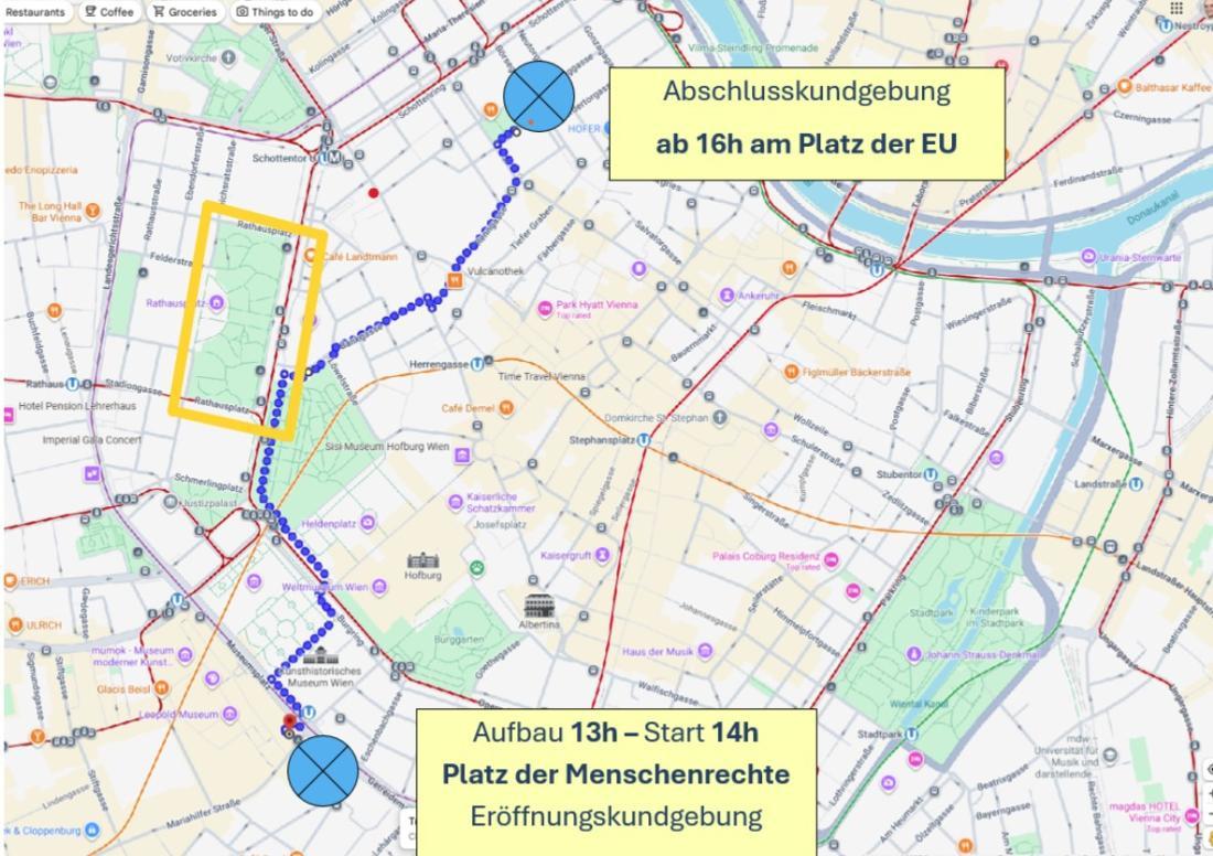 La manifestation en question avait lieu le 29 novembre 2025 à Vienne, à l'occasion de la Journée internationale de solidarité avec le peuple palestinien établie par les Nations-Unies en 1977 (liens archivés ici et ici). L'itinéraire de la manifestation était disponible sur le site web de l'association organisatrice Palestina Solidarität Österreich, et montre que le cortège devait brièvement longer la Rathausplatz, où avait lieu le marché de Noël visible sur la vidéo.
