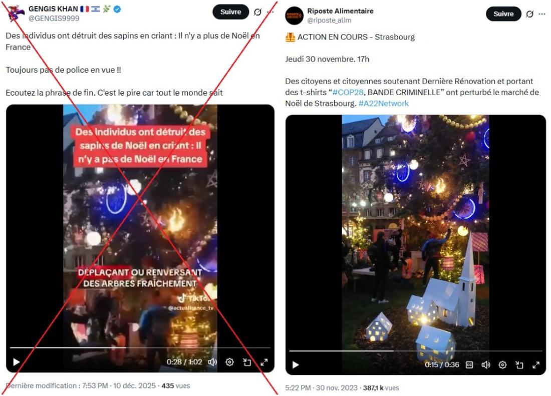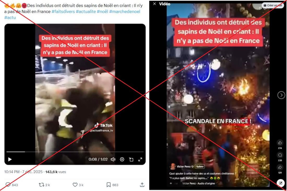 Un grand nombre de publications virales partagées début décembre profitent de ces polémiques : des acteurs d'extrême droite et de faux comptes d'actualité relayent ainsi de prétendues vidéos d''islamistes", "musulmans" ou "gauchistes" s'attaquant à des marchés et des sapins de Noël.