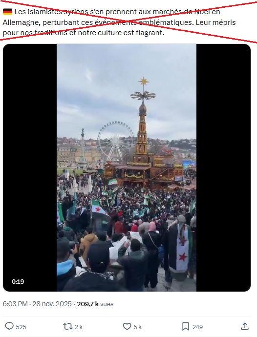 "Les islamistes syriens s'en prennent aux marchés de Noël en Allemagne, perturbant ces événements emblématiques. Leur mépris pour nos traditions et notre culture est flagrant", s'indigne le propriétaire d'un compte diffusant régulièrement de la désinformation, dans une publication partagée plus de 2.000 fois sur X. Sur la vidéo, on voit une large foule réunie sur la Schloßplatz, grande place iconique de la ville de Stuttgart, brandissant des drapeaux syriens.