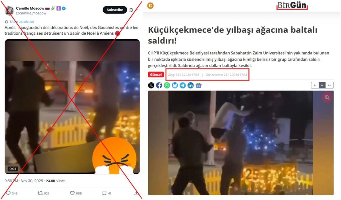 Une recherche d’images inversée révèle que le même extrait circule sur les réseaux sociaux depuis décembre 2024 (lien archivé ici). Contrairement à ce qu’affirme la publication trompeuse, l'incident a eu lieu à Istanbul en 2024, comme l'indique un article du quotidien turc BirGün daté du 23 décembre 2024 (lien archivé ici). D'après la presse turque, l'arbre a été vandalisé suite à l'interdiction des célébrations du Nouvel an dans les universités, décidée par la municipalité, et un autre installé à sa place suite aux dégradations.