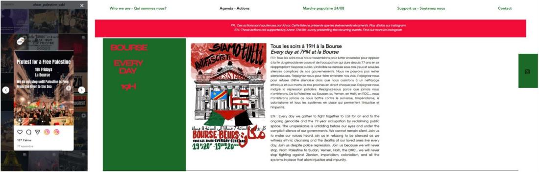 C'est l'un des lieux sur lesquels sont organisés les Plaisirs d'Hiver, un ensemble de marchés de Noël et d'animations foraines du vendredi 28 novembre au 4 janvier à Bruxelles (lien archivé ici). Une recherche sur la page du groupe Ahrar Palestine indique que la manifestation a lieu tous les jours place de la Bourse de 19h à 20h. La page Instagram annonce, elle, que les événements à la Bourse ont lieu "tous les vendredi". L'inauguration des Plaisirs d'Hiver et la tenue de la manifestation aient eu lieu au même endroit de manière fortuite - et non que le marché de Noël aie été "ciblé" par des manifestants.