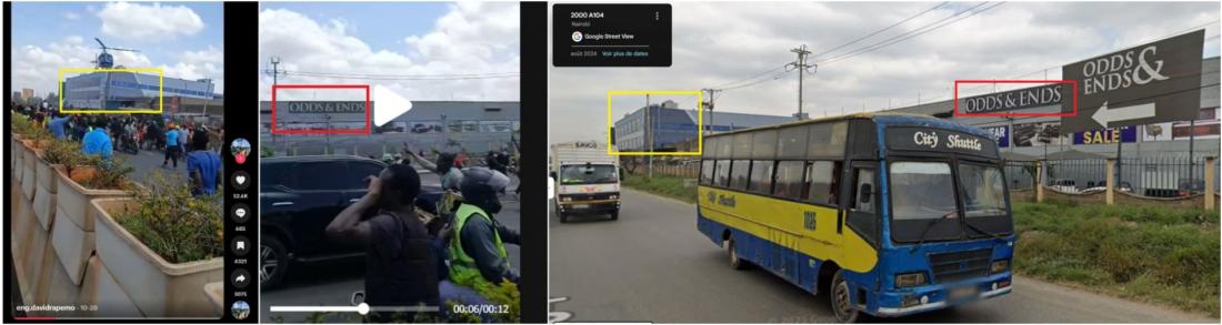 Un indice visuel va nous permettre de déterminer cela avec certitude. En effet, on aperçoit à la 6ᵉ seconde de la vidéo une enseigne "ODDS & ENDS". Une recherche Google avec ce mot-clé et "Kenya" nous conduit vers un magasin situé à Nairobi. Grâce à Google Street View et des indices visuels concordant, on constate que la scène dans notre vidéo virale a bien été filmée devant cette boutique située sur "Mombasa Road", à Nairobi (lien archivé ici).