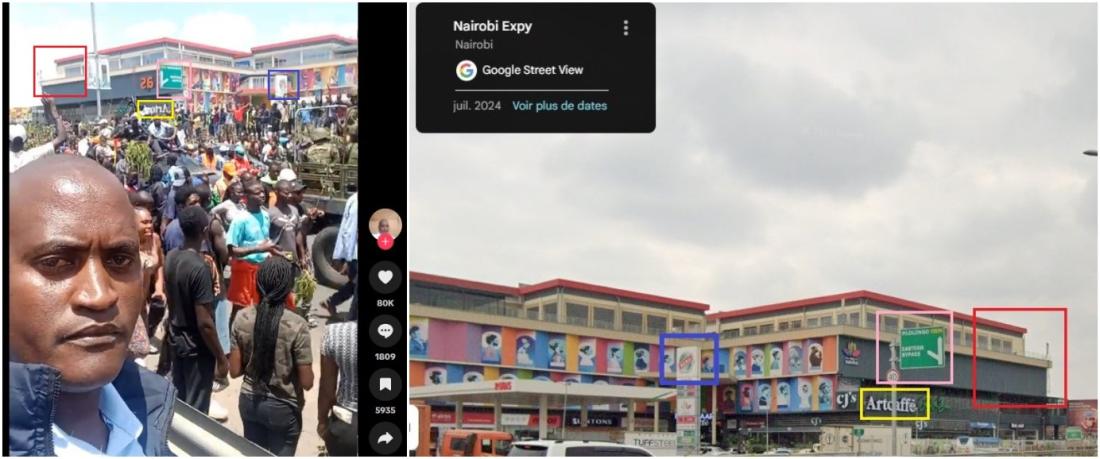 Une recherche d’image inversée sur le bâtiment coloré apparaissant dans la vidéo suggère qu’il s’agit du "Imaara shopping mall", un centre commercial dans la capitale kényane. Google Street View et des indices visuels concordant nous confirment que la vidéo a bien été tournée devant ce bâtiment, situé route de "Nairobi Expy" (lien archivé ici).