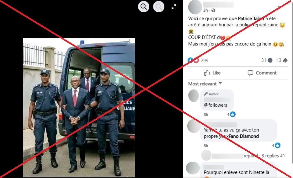 Sur Facebook, plusieurs pages ont publié une image censée selon elles montrer l’arrestation du président béninois Patrice Talon (1, 2, 3, 4).