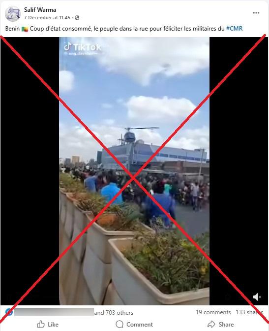 "Benin Coup d'état consommé, le peuple dans la rue pour féliciter les militaires", soutient ainsi la légende d'un des posts, "aimé" plus de 700 fois. Sur la vidéo d'une quinzaine de secondes qu'il met en avant, on aperçoit des centaines de personnes marchant sur une voie rapide et un hélicoptère volant tout près d'eux, avant que l'utilisateur qui filme ne tourne la caméra vers lui.