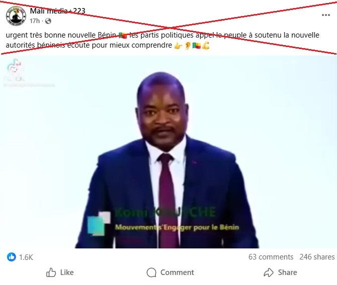 "Bénin : les partis politiques appel[lent] le peuple à soutenir la nouvelle autorités béninois" [sic], affirme ainsi en légende cette publication de Mali Média +223, qui cumule plus de 1.700 "likes".