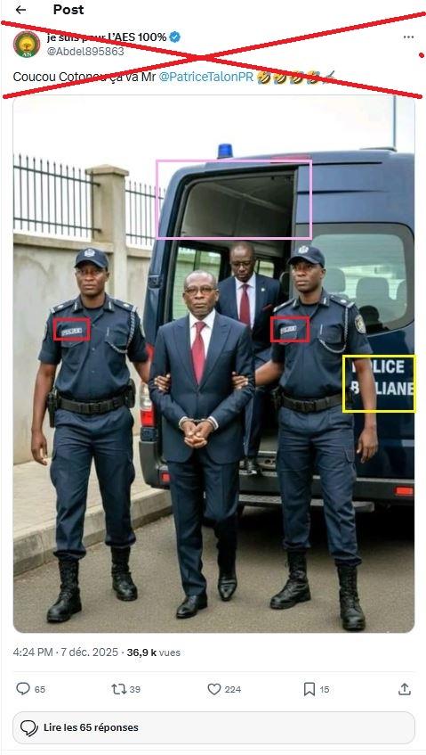 A l'appui de cette affirmation, une image sur laquelle on voit deux policiers encadrant un homme menotté qui ressemble à Patrice Talon.