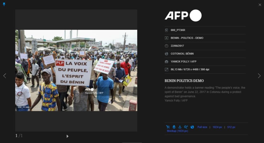 La légende indique qu’il aurait été pris à Cotonou le 22 juin 2017 par le photographe Yanick Folly, pour l’AFP. Avec ces informations, on retrouve en effet le cliché sur le site d’AFP Forum, qui héberge toutes les photos AFP. La légende confirme qu'elle a été prise le 22 juin 2017, lors d'une manifestation organisée par le Front pour le sursaut patriotique afin de dénoncer la gouvernance du président Patrice Talon.