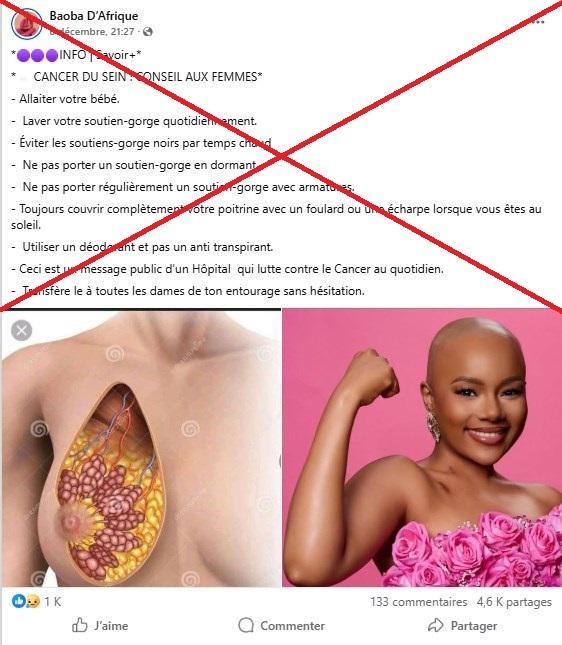 Chaque année, plus de 650.000 personnes décèdent du cancer du sein dans le monde. Depuis début décembre, de nombreuses publications sur Facebook, X ou Instragram conseillent aux femmes d’éviter "les soutiens-gorge noirs par temps chaud" ou encore de ne "pas porter régulièrement de soutien-gorge avec des armatures" pour éviter cette maladie, relançant une rumeur persistante en Afrique francophone. Mais ces affirmations sont infondées : études scientifiques et chercheurs interrogés par l’AFP concluent qu’il n’existe aucune preuve établissant un lien de causalité entre le port du soutien-gorge et le cancer du sein.