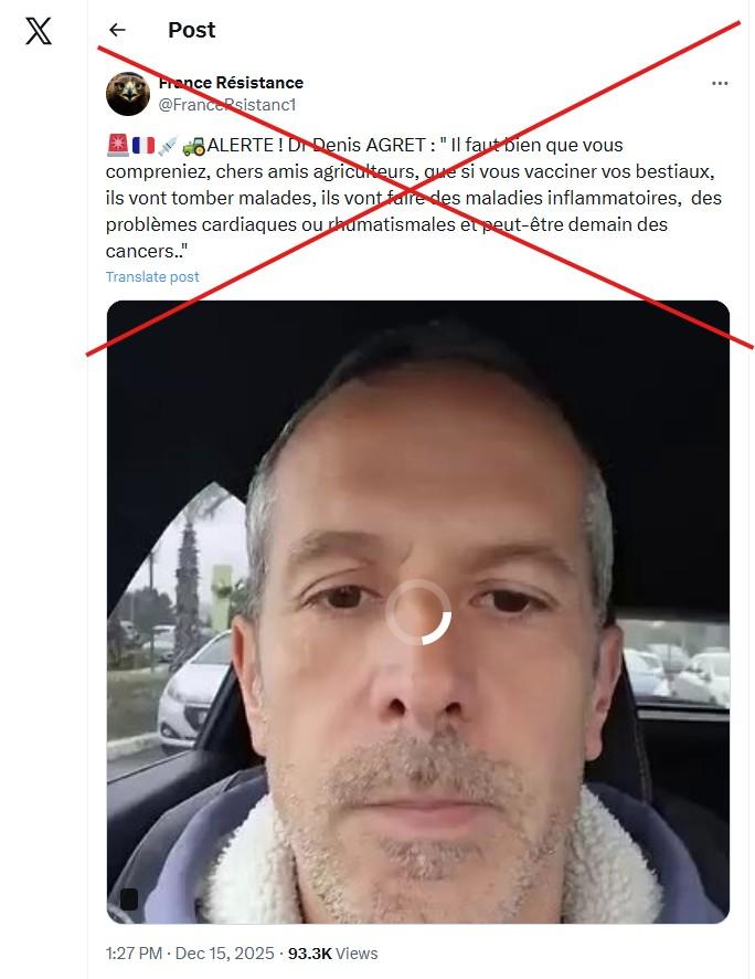 "Il faut bien que vous compreniez, chers amis agriculteurs, que si vous vaccinez vos bestiaux, ils vont tomber malades, ils vont faire des maladies inflammatoires, des problèmes cardiaques ou rhumatismales et peut-être demain des cancers", alerte ainsi Denis Agret - un médecin dont les affirmations sur le Covid-19 ont plusieurs fois fait l'objet d'articles de vérification de l'AFP (1,2,3) - dans une vidéo visionnée près de 100.000 fois sur X.