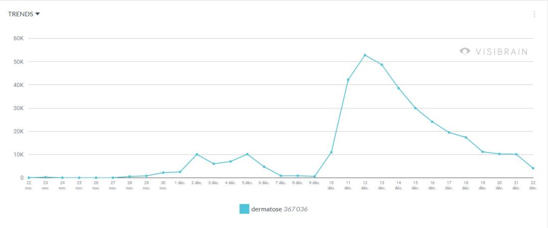 Sur les réseaux sociaux, l'épizootie de dermatose a entraîné une explosion de tweets sur X. Selon l'outil d'analyse Quicktrends de la société Visibrain, "dermatose" a été mentionné plus de 50.000 fois le 12 décembre.
