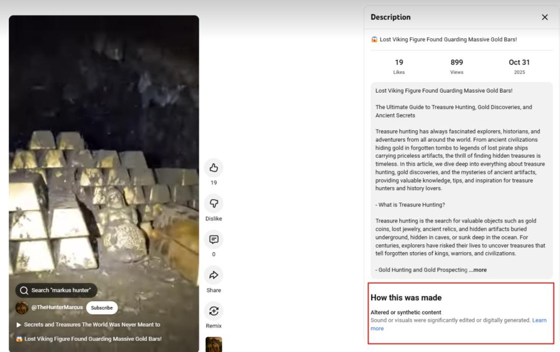 Bien que le compte ne révèle pas que le contenu est généré par IA, toutes les vidéos sont étiquetées comme "contenu modifié ou synthétique", indiquant que "le son ou les visuels ont été fortement modifiés ou générés numériquement".